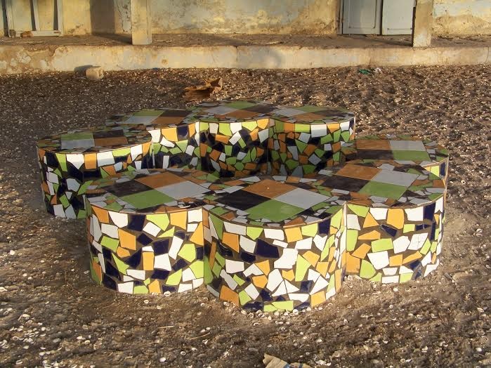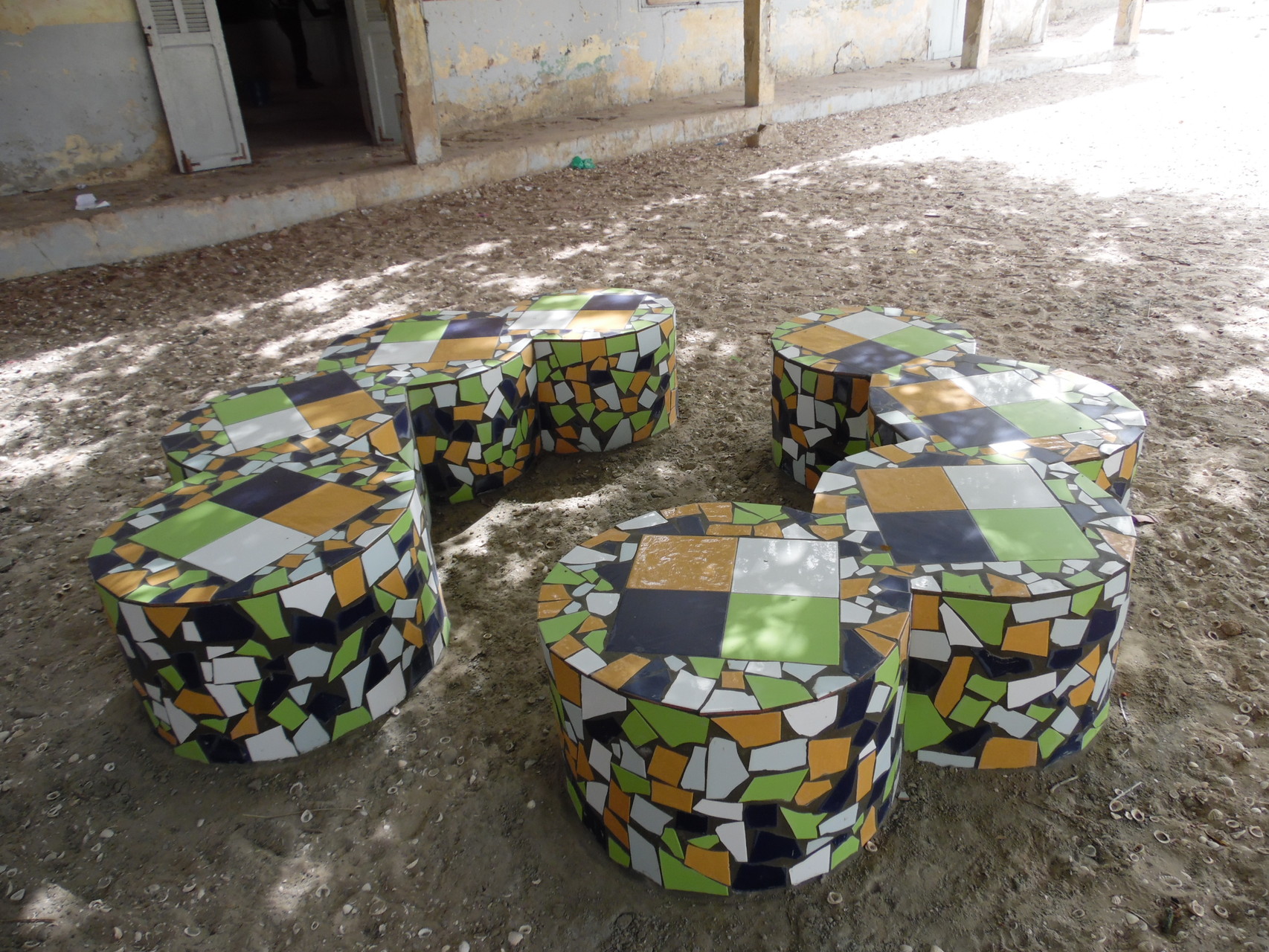 Continuer l'aménagement des différentes classes de l'école primaire de Fimela en mobilier scolaire à partir de plastiques et de pneus récupérés dans la nature.